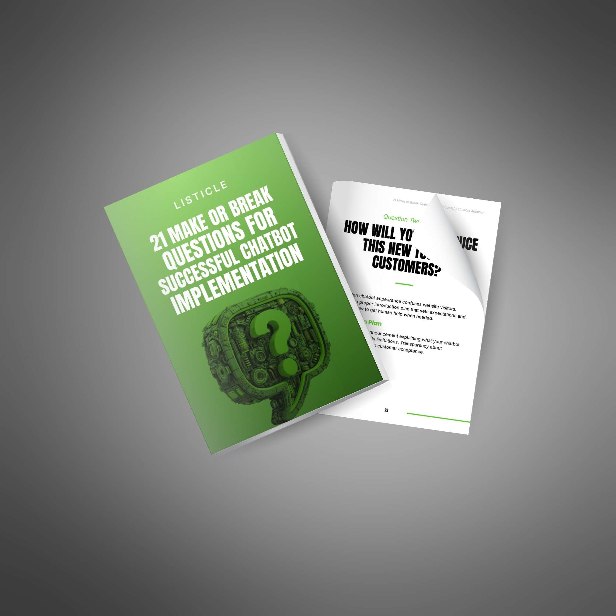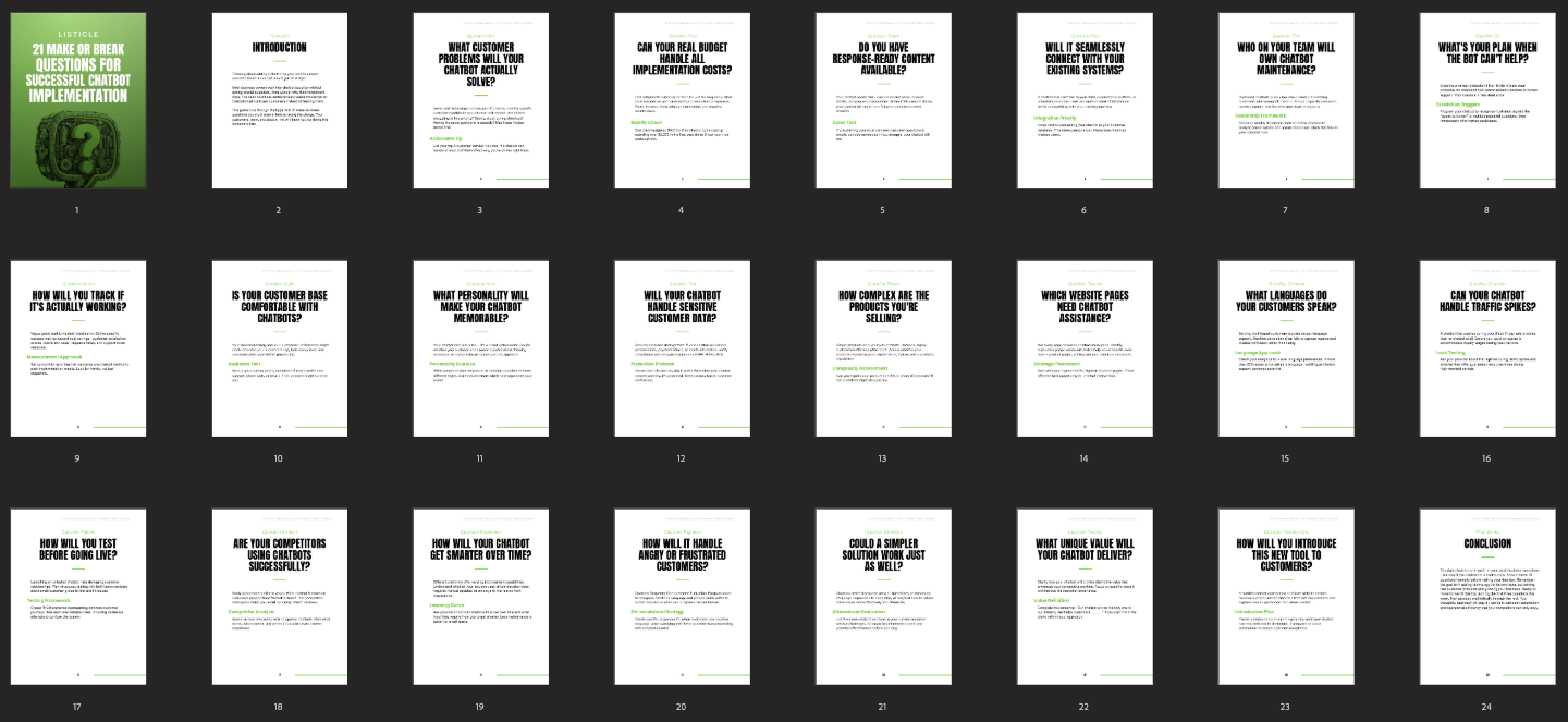 This listicle is a ready-to-use content asset designed to quickly educate, engage, and qualify your audience with skimmable, high-value insights. It’s perfect for resellers who want to offer a lead magnet that helps business owners make smarter chatbot decisions without feeling overwhelmed. With a clear voice and 21 sharp questions, it shows your customers what to think about before adding a chatbot to their website.