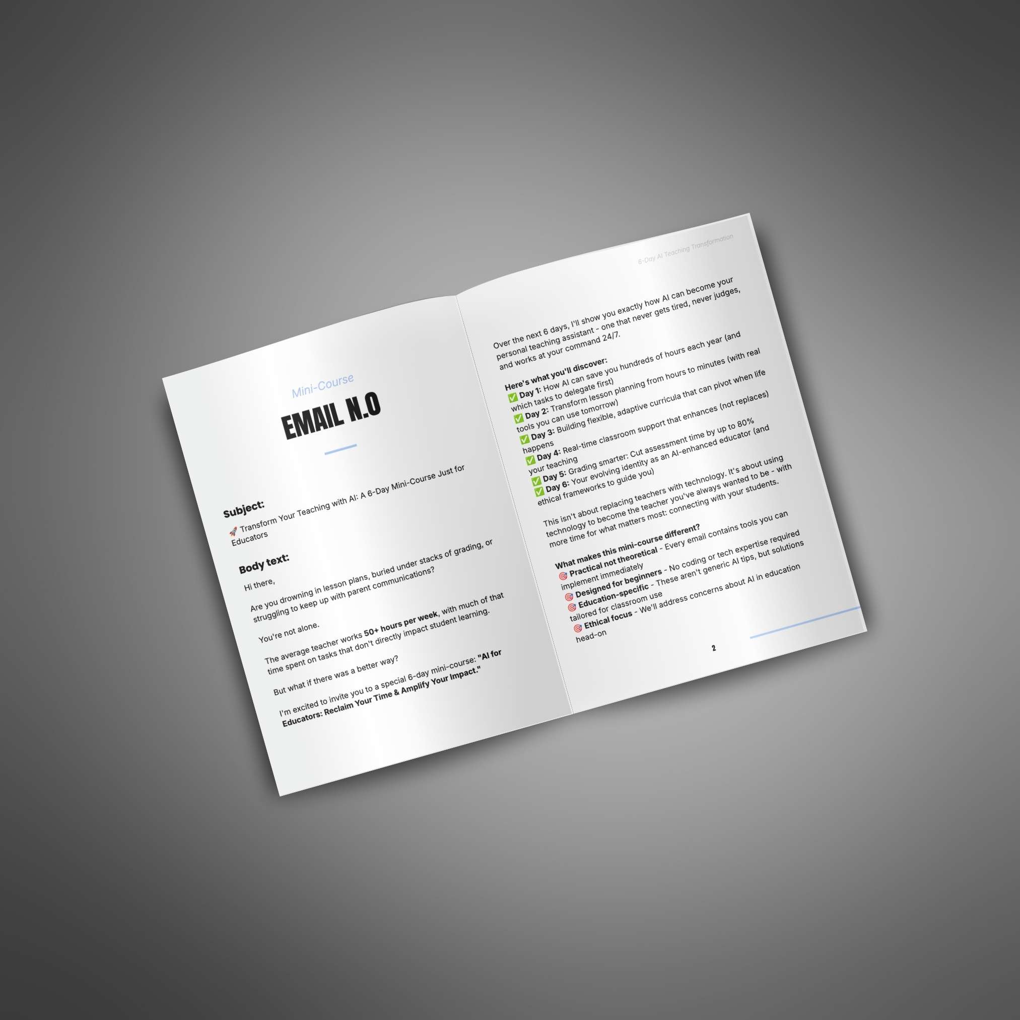 This done-for-you email course gives your customers a structured, easy-to-follow system designed to help them confidently use AI tools in their classrooms. By offering this course, you build authority, naturally upsell your services, and deepen customer trust for stronger long-term relationships.