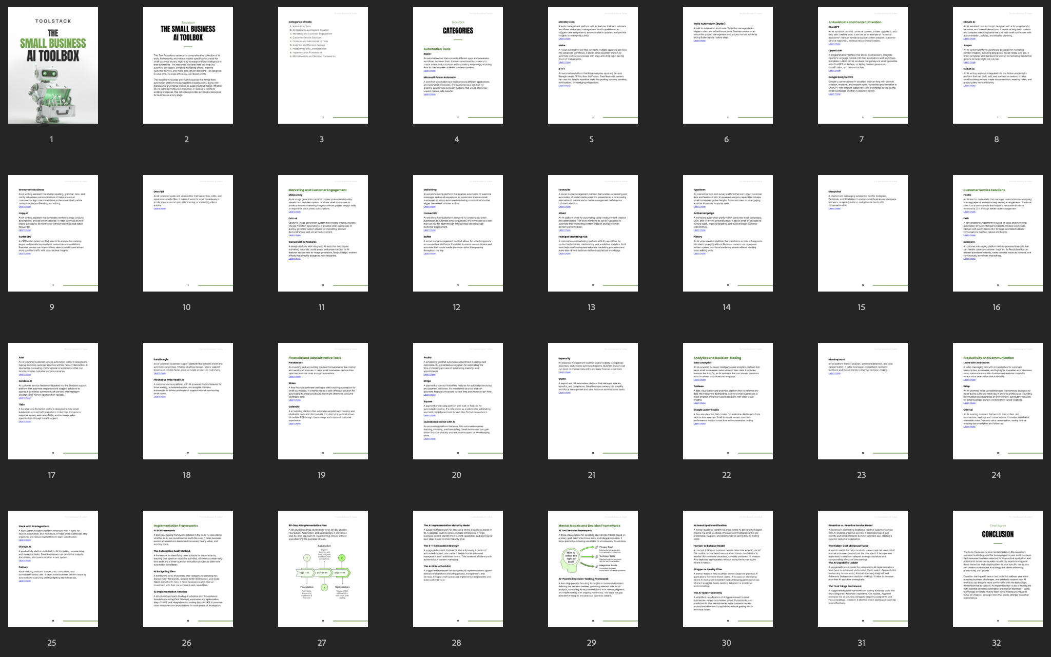 - Implementation Frameworks: Step-by-step systems to help small businesses adopt AI smoothly.